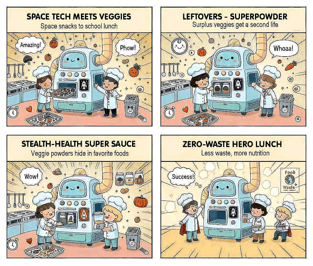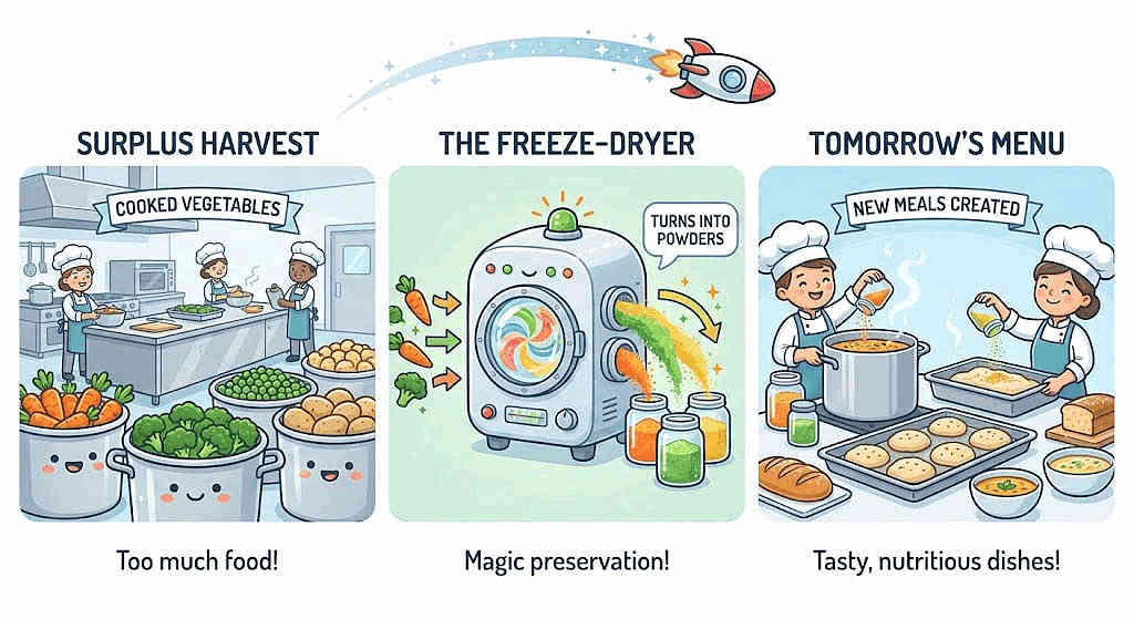 Freeze-drying (originally refined for space missions) removes water at low temperature so that fruits and vegetables retain most of their colour, flavor, and micronutrients while becoming extremely light and shelf-stable. For institutional kitchens, this means yesterday’s steamed broccoli or roasted squash does not have to be binned or composted. Instead, it can be blended, frozen, and freeze-dried into concentrated vegetable powders that can later be whisked into pasta sauces, soups, or smoothies with minimal impact on taste and texture.